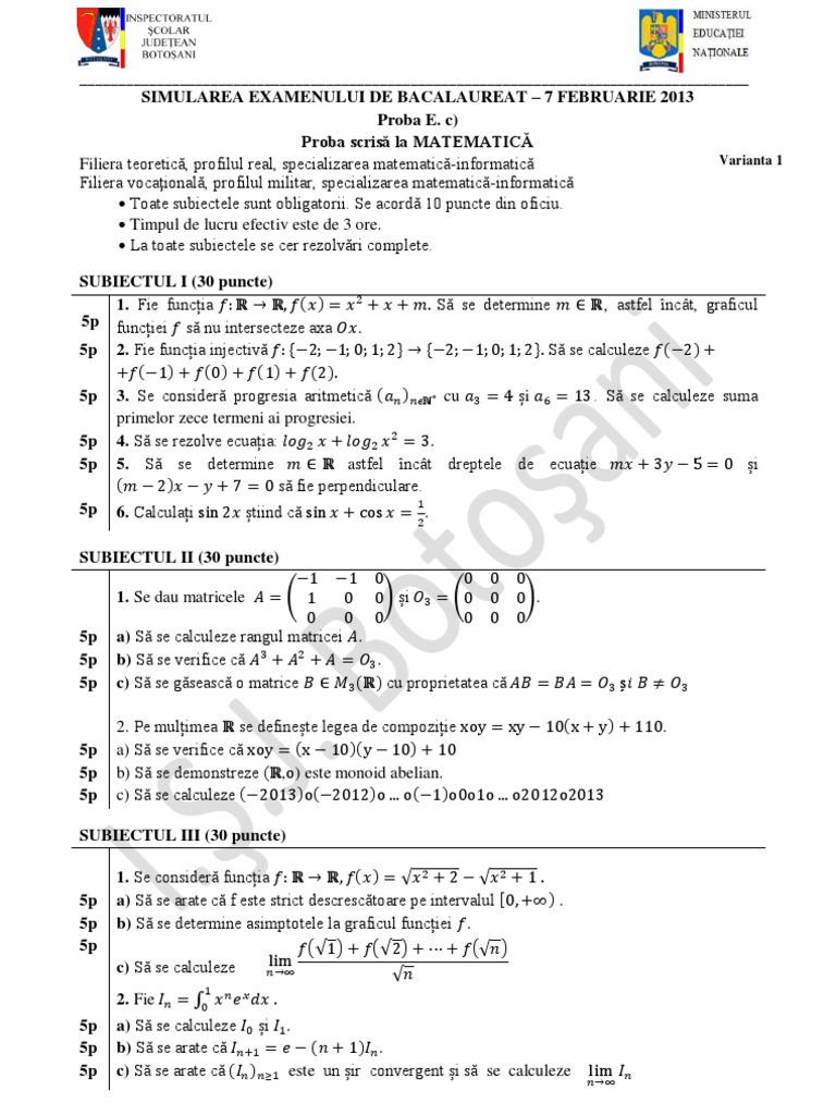 Pentru examenul de bacalaureat 2013 este prezentat spre. Se acorda 10 puncte din oficiu. În unele centre, proba de matematică a început mai târziu din cauza unei defecţiuni la metrou unirii.