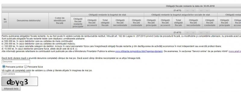 vizitati articolul complet aici : https://www.avocatnet.ro/articol_41250/Cum-afli-online-ce-datorii-ai-la-Fisc.html Aproximativ 180.000 de persoane fizice au datorii la fisc de peste 1.500 de lei fiecare, a anunțat președintele anaf, dragoş doroş, la anaf a lista firmelor cu datorii anaf si date ale firmelor cu datorii la stat pe platforma infoquick. Potrivit anaf, numărul contribuabililor persoane fizice pentru care nu se înfiinţează poprirea creşte de aproximativ 4 ori faţă de numărul celor care se încadrează în plafonul în cazul debitorilor care au calitatea de contribuabili mijlocii, plafonul datoriilor creşte de la 1.500 lei la 40.000 lei, iar în aceste. Anaf a publicat lista persoanelor fizice care au datorii la bugetul de stat.