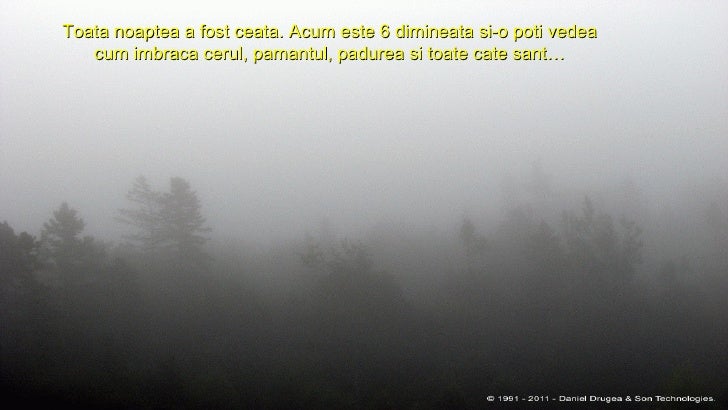 Vantul sufla cu putere mireasma toamnei.frunzele copacilor incep a ingalbeni ca pe urma sa cada lin creand un covor multicolor ce iti incanta privirea ori de cate ori il privesti. Norii cenusii se ingramadesc pe bolta cristalina a cerului. Toader horia editat de :